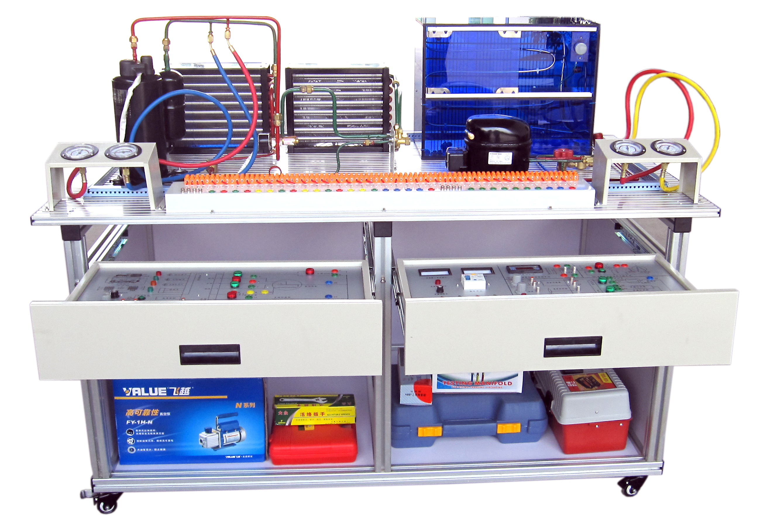制冷制熱實(shí)訓(xùn)設(shè)備、制冷制熱實(shí)訓(xùn)裝置是職業(yè)技能課程制冷制熱教學(xué)實(shí)訓(xùn)設(shè)備,冰箱實(shí)訓(xùn)設(shè)備、空調(diào)實(shí)訓(xùn)設(shè)備主要承擔(dān)電類專業(yè)的《制冷制熱技術(shù)》等課程的實(shí)訓(xùn)教學(xué)任務(wù),同時(shí)可面向社會開展制冷設(shè)備維修工(中、高級)和家用電器產(chǎn)品維修工(中、高級)職業(yè)技能培訓(xùn)與鑒定工作。制冷制熱實(shí)訓(xùn)設(shè)備屬于教、學(xué)、做一體化實(shí)訓(xùn)室,制冷制熱儀器設(shè)備可供學(xué)生完成《制冷制熱技術(shù)》等課程的實(shí)訓(xùn)教學(xué)。主要可對學(xué)生開展冰箱電氣檢修、空調(diào)檢修、空調(diào)移機(jī)、制冷劑加注、管路操作等實(shí)訓(xùn)內(nèi)容,并具備制冷維修工技能鑒定資質(zhì)。教學(xué)做、理實(shí)一體化,增加了師生之間的互動,提高了教學(xué)效果。在組裝調(diào)試過程中,學(xué)生遇到故障問題,指導(dǎo)老師幫助其分析故障原因,指導(dǎo)學(xué)生動手解決故障問題。制冷制熱實(shí)訓(xùn)裝置特色是:實(shí)訓(xùn)設(shè)備全面的涵蓋了制冷、制熱等電器的所有原理性電路,既能夠讓學(xué)生迅速融入實(shí)物學(xué)習(xí)的外觀體現(xiàn),也能夠?qū)﹄娖鞯慕Y(jié)構(gòu)和組成有清楚的認(rèn)識。實(shí)訓(xùn)室有大量的舊冰箱、空調(diào)實(shí)物可供學(xué)生拆卸、組裝,讓學(xué)生對制冷制熱設(shè)備有更加深刻的理解。通過實(shí)制冷制熱實(shí)訓(xùn)教學(xué),可使學(xué)生熟悉常用儀器儀表,熟練使用儀器儀表,更好的掌握制冷制熱裝置的維修技術(shù),為以后的發(fā)展奠定基礎(chǔ),從而提高學(xué)生實(shí)際動手能力和就業(yè)競爭力。制冷設(shè)備運(yùn)用與維修,培養(yǎng)在制冷與空調(diào)制造行業(yè),從事產(chǎn)品設(shè)計(jì)、技術(shù)管理與質(zhì)量管理;在制冷與空調(diào)設(shè)備經(jīng)營行業(yè),從事產(chǎn)品的銷售、售后服務(wù)和經(jīng)營管理;在制冷與空調(diào)設(shè)備使用單位,從事制冷與空調(diào)系統(tǒng)運(yùn)行管理和操作維修的中、高技能人才。制冷技術(shù)、制冷基礎(chǔ)技能實(shí)訓(xùn)、冰箱、家用空調(diào)器原理與維修、工程熱力學(xué)、電工基礎(chǔ)及實(shí)訓(xùn)、電力拖動原理與技能實(shí)訓(xùn)、工程制圖與CAD、中央空調(diào)運(yùn)行管理與維護(hù)、汽車空調(diào)安裝及維修、冷庫設(shè)計(jì)安裝與維護(hù)、制冷空調(diào)自動控制技術(shù)等課程。畢業(yè)就業(yè)方向:空調(diào)生產(chǎn)企業(yè)的質(zhì)檢、工藝、基層管理、生產(chǎn)設(shè)備維護(hù)工作,中央空調(diào)、冷庫的安裝、運(yùn)行管理、維護(hù),空調(diào)工程的預(yù)算、輔助設(shè)計(jì)工作,空調(diào)、冷庫和制冷設(shè)備等空調(diào)制冷行業(yè)的營銷、銷售代理、售后服務(wù)工作。 上海碩博弘揚(yáng)大國工匠精神, 發(fā)展職業(yè)教育,應(yīng)用教學(xué)設(shè)備,為企業(yè)培養(yǎng)高技能人才,而專業(yè)生產(chǎn):制冷與空調(diào)實(shí)訓(xùn)設(shè)備、可視化制冷性能測試培訓(xùn)裝置、一機(jī)兩庫系統(tǒng)綜合實(shí)訓(xùn)裝置、小型冷庫制冷系統(tǒng)綜合實(shí)訓(xùn)考核裝置、小型冷庫制冷系統(tǒng)實(shí)訓(xùn)考核裝置、熱空調(diào)制冷制熱系、實(shí)訓(xùn)考核裝置、整體式空調(diào)電氣實(shí)訓(xùn)智能考核裝置、變頻空調(diào)電氣實(shí)訓(xùn)智能考核裝置、空調(diào)冰箱組裝與調(diào)試實(shí)訓(xùn)考核裝置(智能考核型)、制冷系統(tǒng)原理與性能測試多功能實(shí)驗(yàn)裝置、空調(diào)與冰箱組裝及電氣控制系統(tǒng)原理與維修實(shí)訓(xùn)臺、現(xiàn)代制冷與空調(diào)系統(tǒng)實(shí)訓(xùn)考核裝置、電冰箱制冷系統(tǒng)實(shí)訓(xùn)考核裝置(直冷)、冰箱技能實(shí)訓(xùn)考核裝置、家用電冰箱微電腦式溫控電氣實(shí)訓(xùn)考核裝置、空調(diào)/冰箱制冷制熱實(shí)訓(xùn)考核裝置、變頻空調(diào)電氣實(shí)訓(xùn)智能考核裝置、半導(dǎo)體制冷技術(shù)實(shí)訓(xùn)裝置、智能型制冷壓縮機(jī)性能測試實(shí)訓(xùn)裝置、柜式空調(diào)技能綜合實(shí)訓(xùn)考核裝置、制冷電路電氣控制實(shí)訓(xùn)板、制冷管路維修基本技能實(shí)訓(xùn)裝置、壓縮機(jī)解剖,拆裝實(shí)訓(xùn)設(shè)備、制冷制熱實(shí)驗(yàn)室設(shè)備、整體式空調(diào)電氣實(shí)訓(xùn)考核裝置、低溫箱電氣實(shí)訓(xùn)智能考核裝置、一機(jī)兩庫電氣實(shí)訓(xùn)考核裝置、組合式空調(diào)機(jī)組實(shí)訓(xùn)裝置、空調(diào)制冷綜合實(shí)訓(xùn)裝置、除濕機(jī)維修技能與考核裝置、空調(diào)制冷換熱綜合實(shí)驗(yàn)裝置、制冷制熱維修測試綜合實(shí)訓(xùn)平臺、制冷壓縮機(jī)性能測定實(shí)驗(yàn)裝置、制冷制熱實(shí)驗(yàn)室設(shè)備(制冷制熱實(shí)驗(yàn)臺、制冷空調(diào)實(shí)驗(yàn)臺)、變頻空調(diào)制冷制熱實(shí)驗(yàn)室設(shè)備、變頻空調(diào)實(shí)驗(yàn)臺、蓄冷空調(diào)制冷技術(shù)實(shí)訓(xùn)裝置、熱泵型分體空調(diào)實(shí)訓(xùn)考核裝置、空調(diào)維修操作實(shí)訓(xùn)裝置