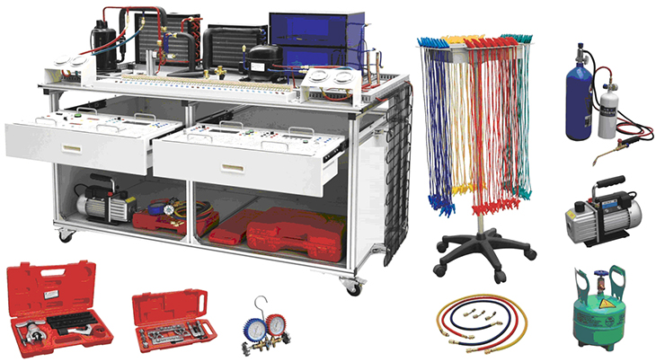 1、實(shí)訓(xùn)臺采用鋁型材臺架加實(shí)訓(xùn)模塊結(jié)構(gòu),裝置采用一體化設(shè)計(jì),由導(dǎo)軌式鋁合金安裝平臺、空調(diào)系統(tǒng)、電冰箱系統(tǒng)、電氣控制系統(tǒng)等組成。底部安裝有四個帶剎車的腳輪,可以方便的移動和固定。設(shè)備配置空調(diào)制冷系統(tǒng)管路1套、直冷電冰箱制冷系統(tǒng)管路1套、安全插端子排,壓力表(1.5MPa)2只(3.5 MPa)2只等。