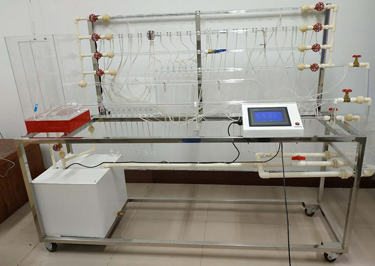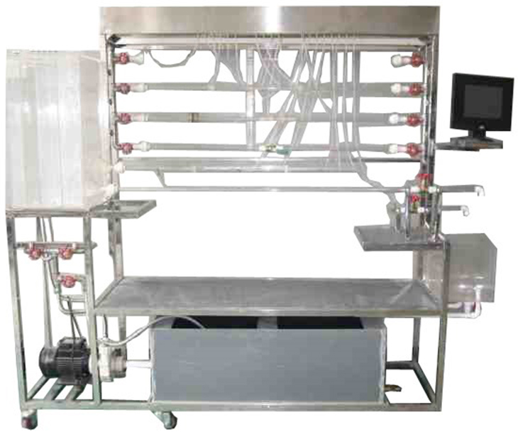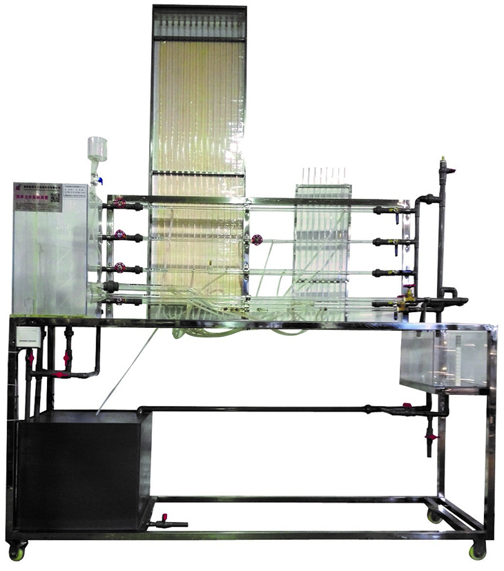 移動(dòng)式不銹鋼實(shí)驗(yàn)臺、儲水箱;雷諾測試管;伯努利測試管;沿程阻力系數(shù)測試管;突擴(kuò)、突縮測試管;閥門局部阻力系數(shù)測試管;孔板流量計(jì)測試管;文丘里流量計(jì)測試管;和皮托管測試管;測壓板直接顯示總水頭線和測壓管水頭線;壓力傳感器24套、流量傳感器4套、溫度傳感器1套、觸摸屏、測壓板。