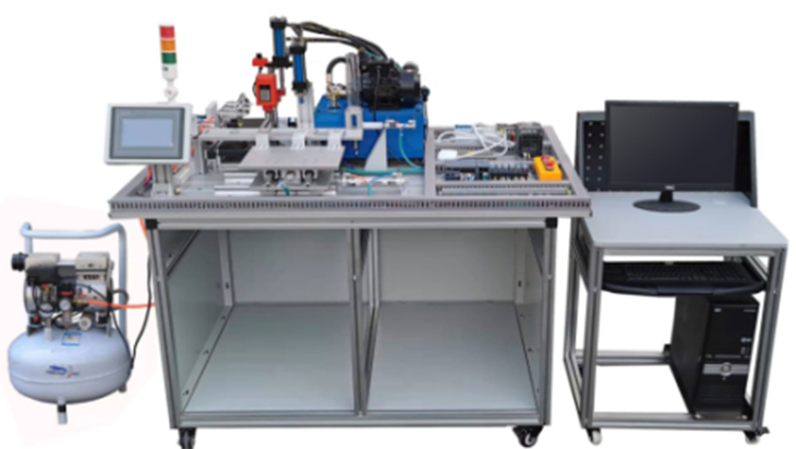 機(jī)電液氣一體化綜合實(shí)訓(xùn)考核裝置實(shí)訓(xùn)工作臺(tái)架為鋁合金型材結(jié)構(gòu),在上面可安裝上料單元、間歇式傳送及夾緊單元、沖壓?jiǎn)卧、鉆孔單元和分揀單元,并配有PLC主機(jī)、變頻器、觸摸屏、傳感器、三相異步交流電機(jī)、交流減速電機(jī)、直流電機(jī)、液壓機(jī)系統(tǒng)、鉆機(jī)及其液壓進(jìn)給系統(tǒng)、氣壓傳動(dòng)系統(tǒng)等,構(gòu)成一個(gè)典型的機(jī)電氣液綜合應(yīng)用系統(tǒng)?梢赃M(jìn)行典型機(jī)電氣液一體化系統(tǒng)的安裝、液壓氣動(dòng)管路安裝、電氣控制線路布線、觸摸屏與PLC編程及調(diào)試、整機(jī)調(diào)試及運(yùn)行等技能訓(xùn)練,從而使學(xué)生掌握機(jī)電氣液的相關(guān)知識(shí)和技能。
