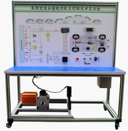 檢測控制面板(裝有各種檢測端子,1448×940mm彩色電路圖和工作原理示意圖)、組合儀表、點(diǎn)火開關(guān)、電機(jī)控制器、車載充電器與充電接口、DC-DC轉(zhuǎn)換器、鋰動(dòng)力電池組、電動(dòng)車電機(jī)(永磁同步電機(jī))、剎車開關(guān)、檔位開關(guān)、油門控制裝置、大電流繼電器、電源總開關(guān)、急停開關(guān)、輔助蓄電池(12V45AH)、一體化全鋁合金型材搭建的移動(dòng)臺(tái)架(1500×700×1700mm (帶自鎖腳輪裝置,帶安裝檢測端子的原理面板,面板1448×940mm)、設(shè)備操作說明書。