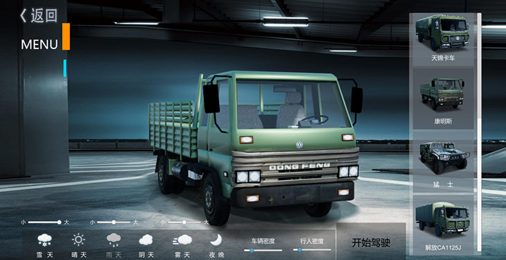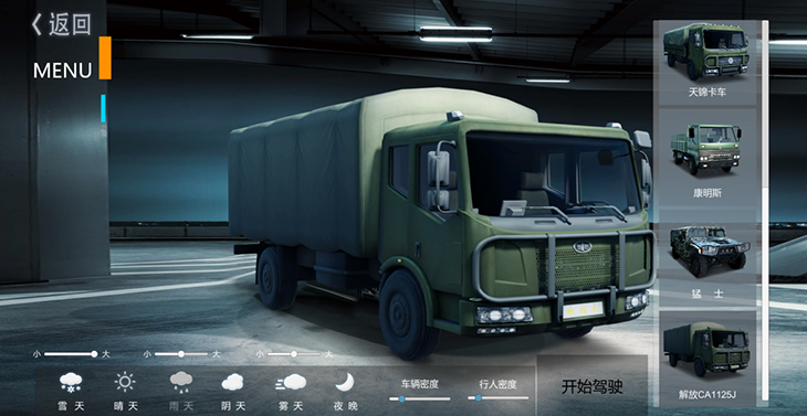 7.1、仿真車模型:10 種典型虛擬車輛模型:東風猛士、北汽勇士、 EQ1118、EQ1121、 EQ2102、SX2150、SX2190、豪濼 ZZ2197、東風天錦、大客車等,并可根據(jù)需要拓展、定制個 性化車輛模型。