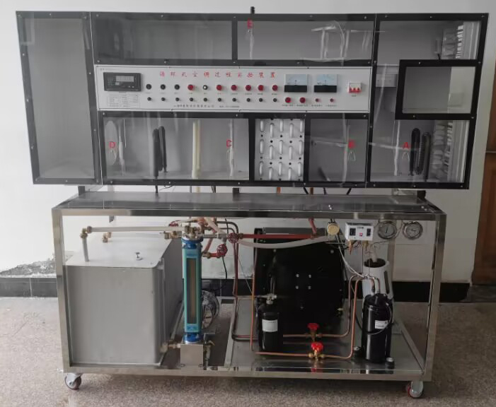 空氣熱濕處理實驗裝置為《空氣調(diào)節(jié)》課程實驗教學(xué)設(shè)備,用它可以模擬不同季節(jié)室內(nèi)和室外的環(huán)境和空氣處理調(diào)節(jié)的方法,進 行集中式空調(diào)系統(tǒng)不同循環(huán)形式的空氣調(diào)節(jié)實驗。還可以 做變風量運行調(diào)節(jié)實驗和制冷系統(tǒng)的參數(shù)測定及其調(diào)節(jié)實驗。裝置具有透明風管,可直觀地觀察和測試。實驗裝置的 結(jié)構(gòu)由空氣循環(huán)系統(tǒng)、加濕器、加熱器、冷卻器及其冷水 機組和相應(yīng)的測試儀表等組成?梢詫崿F(xiàn)對空氣的加熱、冷卻、加濕和除濕(表冷式和淋水式可互換使用)等處理。 在實驗中,還可以對空氣的溫度、濕度、流量進行測量,并 能對加溫器、加熱器的輸入電功率進行測定,從而可以計算各空氣處理過程中的熱量和濕量得失,以及進行熱、濕平衡 的分析。