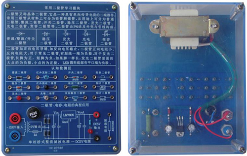 底盒使用190mm×145mm的開模有機(jī)透明塑料底盒,模塊面板采用印制電路板PCB工藝,可以直觀看到器件的實(shí)物及相關(guān)的原理介紹。對于典型應(yīng)用及易損器件安裝在面板背面,透過透明底盒能夠看到器件實(shí)物,方便感性認(rèn)識、檢測測試,同時(shí)也能防止器件的損傷。