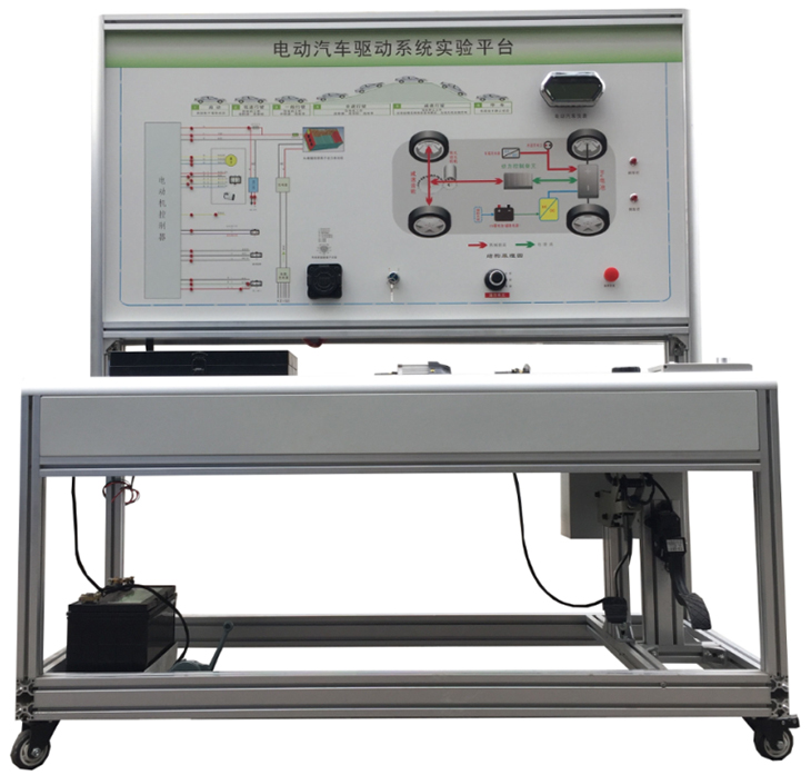 檢測(cè)控制面板(裝有各種檢測(cè)端子,1448×940mm彩色電路圖和工作原理示意圖)、組合儀表、點(diǎn)火開(kāi)關(guān)、電機(jī)控制器、車(chē)載充電器與充電接口、DC-DC轉(zhuǎn)換器、鋰動(dòng)力電池組、電動(dòng)車(chē)電機(jī)(直流無(wú)刷電機(jī))與變速箱、后輪左右液壓制動(dòng)裝置、驅(qū)動(dòng)橋傳動(dòng)裝置、剎車(chē)開(kāi)關(guān)、檔位開(kāi)關(guān)、油門(mén)控制裝置、大電流繼電器、電源總開(kāi)關(guān)、急停開(kāi)關(guān)、輔助蓄電池(12V45AH)、一體化全鋁合金型材搭建的移動(dòng)臺(tái)架(1500×700×1700mm (帶自鎖腳輪裝置,帶安裝檢測(cè)端子的原理面板,面板1448×940mm)、故障考核系統(tǒng)、設(shè)備操作說(shuō)明書(shū)。
