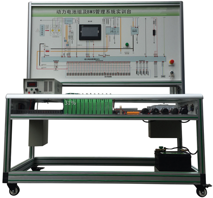 磷酸鐵鋰動力電池包與鐵制電池箱(單體電池3.2V 20AH,24串)、BMS鋰電管理一體機、動力電池包觸摸顯示屏、車載充電機、國標充電插口、國標充電槍、緊急斷電開關、霍爾電流傳感器、直流接觸器(包含充電繼電器、總正繼電器、總負繼電器、預充繼電器)、DC-DC轉換器(72V-12V30A)、輔助蓄電池(12V45AH)、放電控制繼電器與放電負載電阻、預充電阻器、可移動實訓臺(1500×700×1700mm 帶自鎖腳輪裝置,帶安裝檢測端子的原理面板,面板1448×940mm)、故障模擬與排除裝置、設備操作說明書。