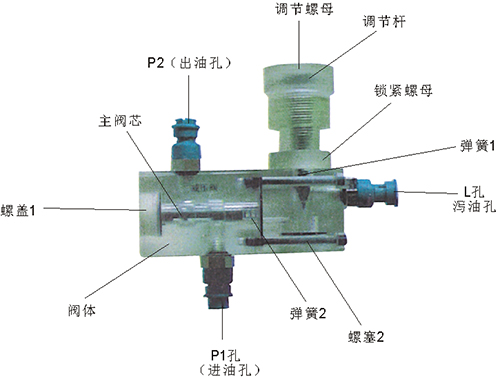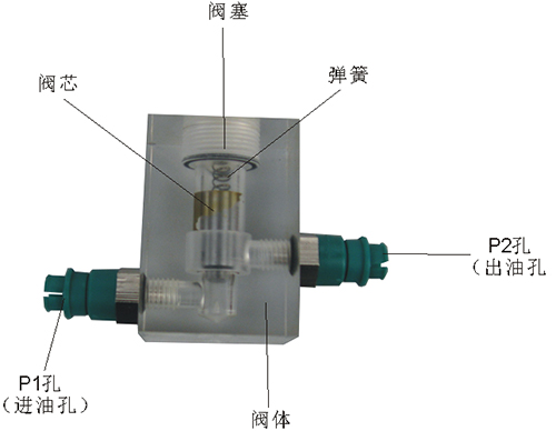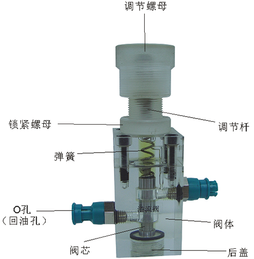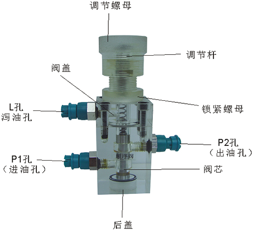 2、溢流閥結(jié)構(gòu)上參考了國(guó)產(chǎn)P-63B型低壓直動(dòng)式溢流閥,其閥體閥蓋、鎖緊螺母、調(diào)節(jié)螺母、螺塞等采用了進(jìn)口透明有機(jī)玻璃材料精制而成,閥芯、調(diào)節(jié)桿采用了45#中碳鋼材料。并配合彈簧,油接頭,密封圈等標(biāo)準(zhǔn)件裝配而成,通過(guò)它可明確地觀察到閥芯、彈簧、油孔等結(jié)構(gòu)及其運(yùn)行過(guò)程,具有形象逼真,性能可靠等優(yōu)點(diǎn)。它即可作為教學(xué)模型,也可以作為液壓實(shí)驗(yàn)元件進(jìn)行實(shí)驗(yàn)演示。